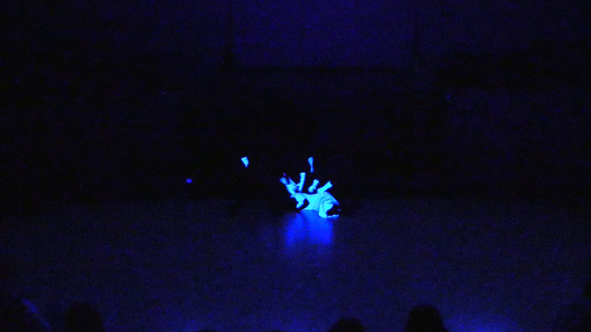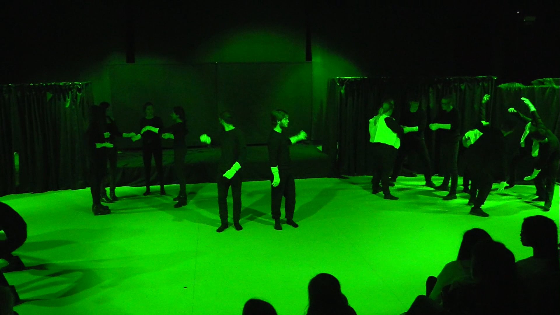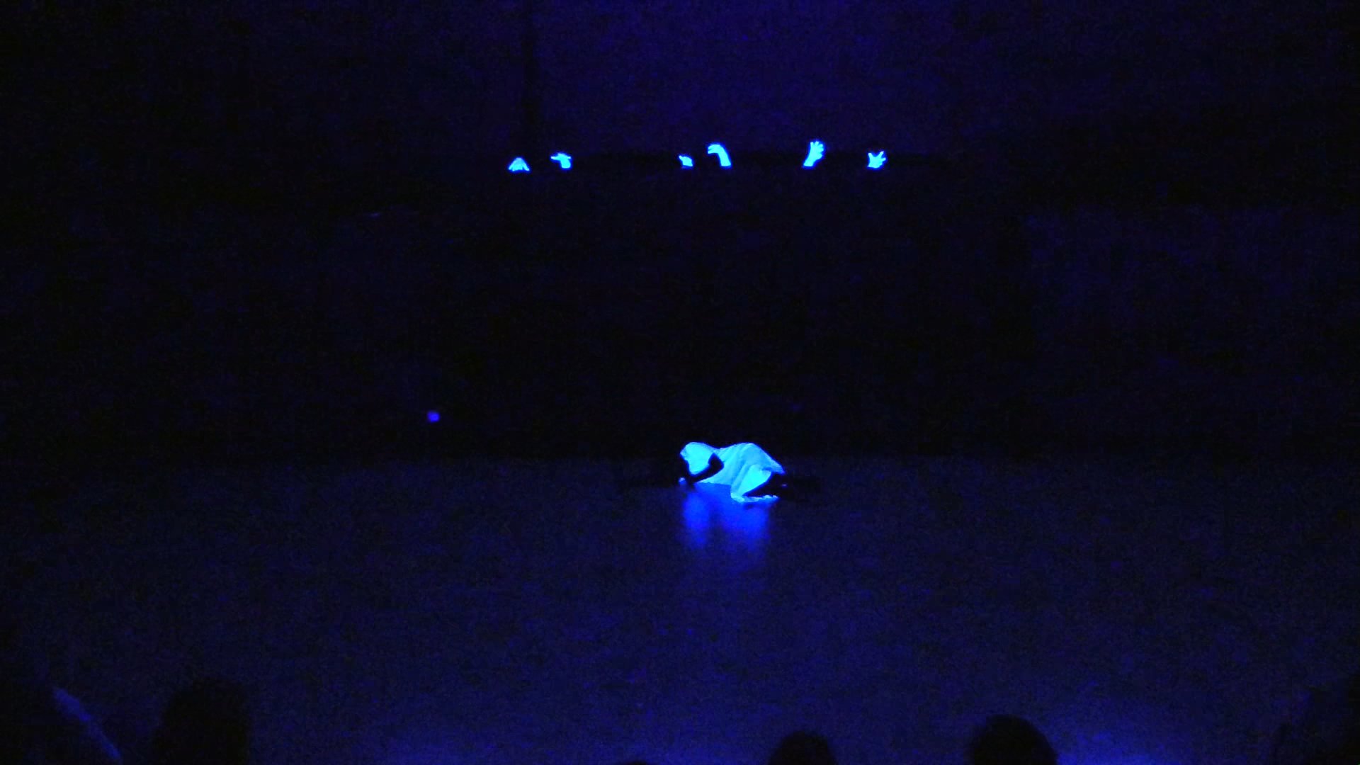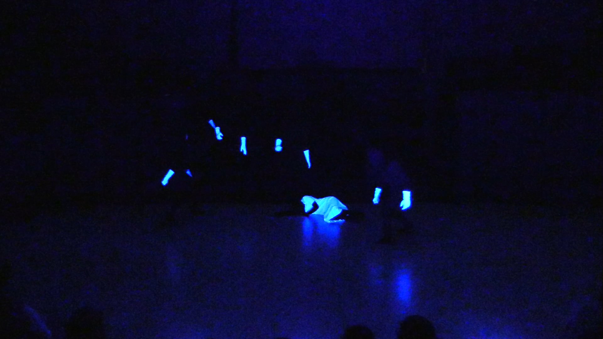 und erreichten einen hohen atmosphärischen Effekt durch die Kombination unseres aufgesplitteten Spiels mit Schwarzlicht-Szenerien, weshalb die Kostüme und alle Ausstattungsgegenstände in Schwarz und reflektierendem Weiß gewählt und hergestellt wurden.