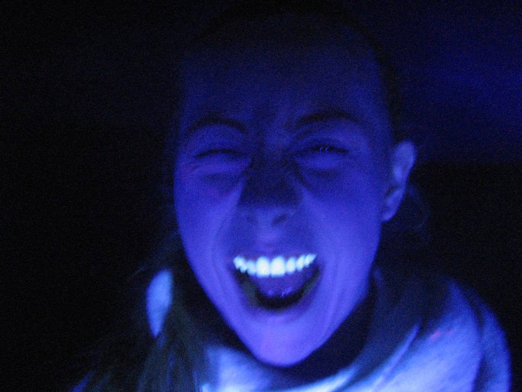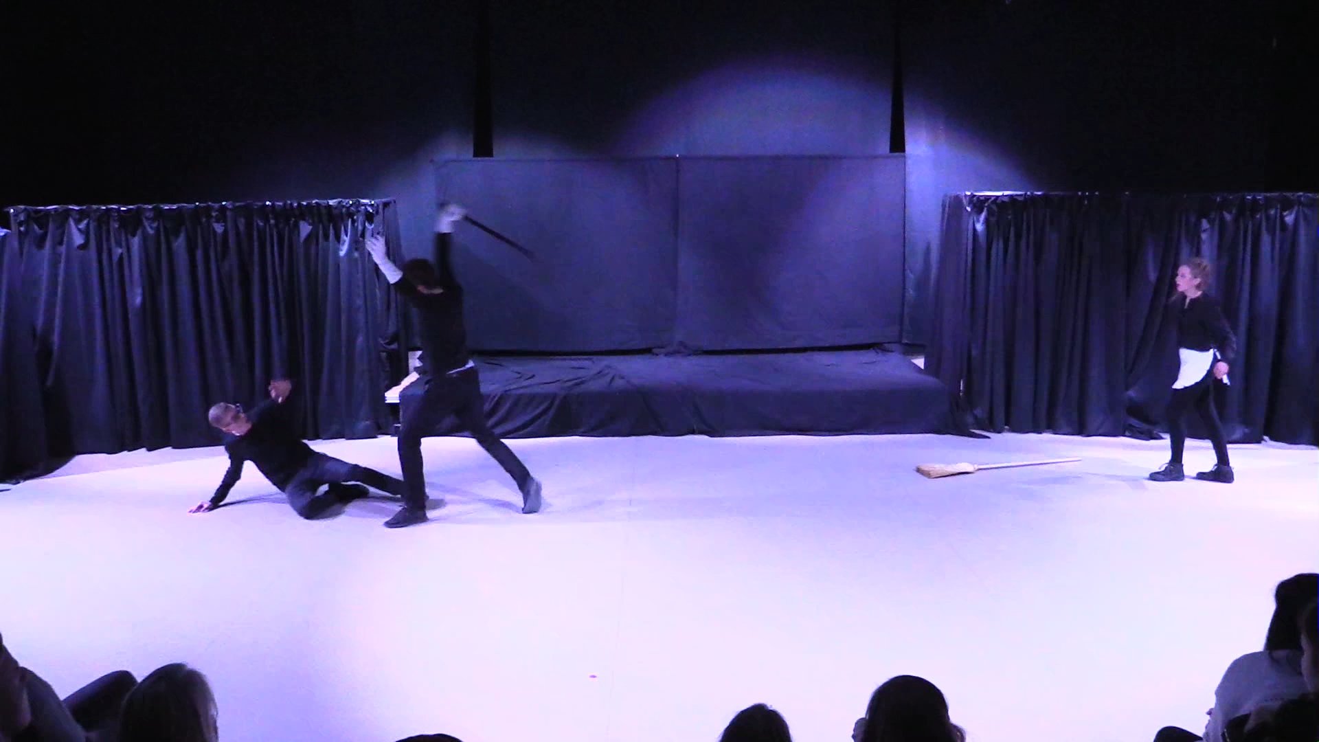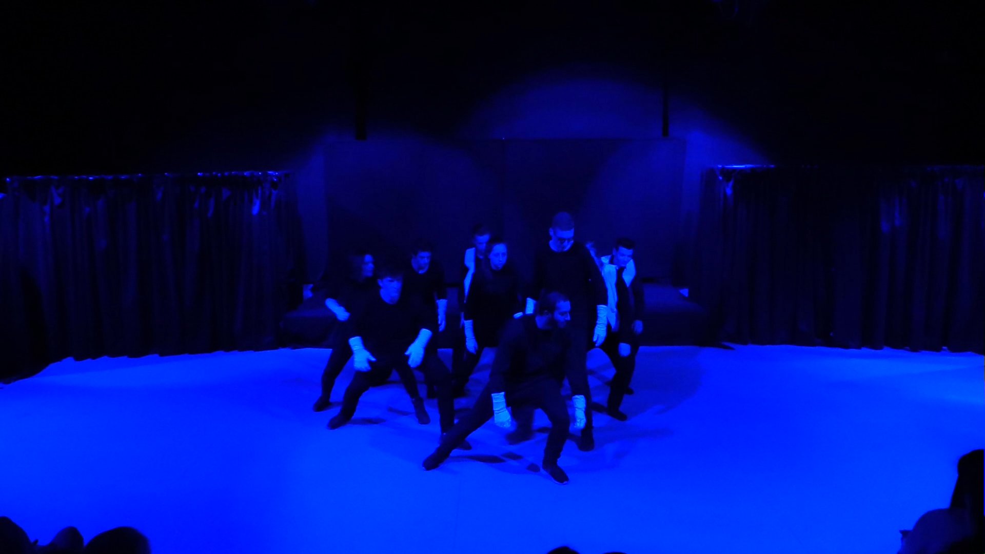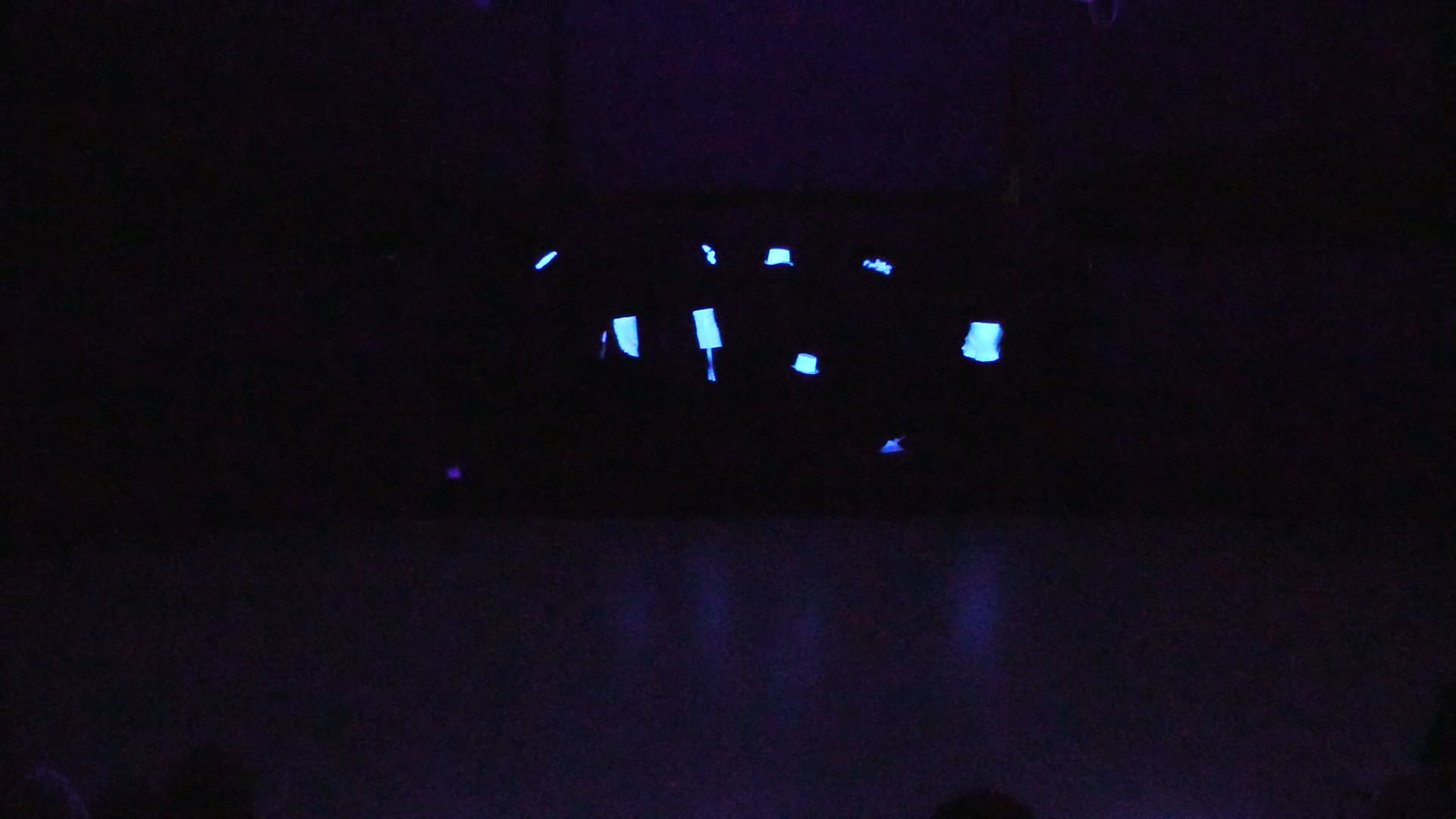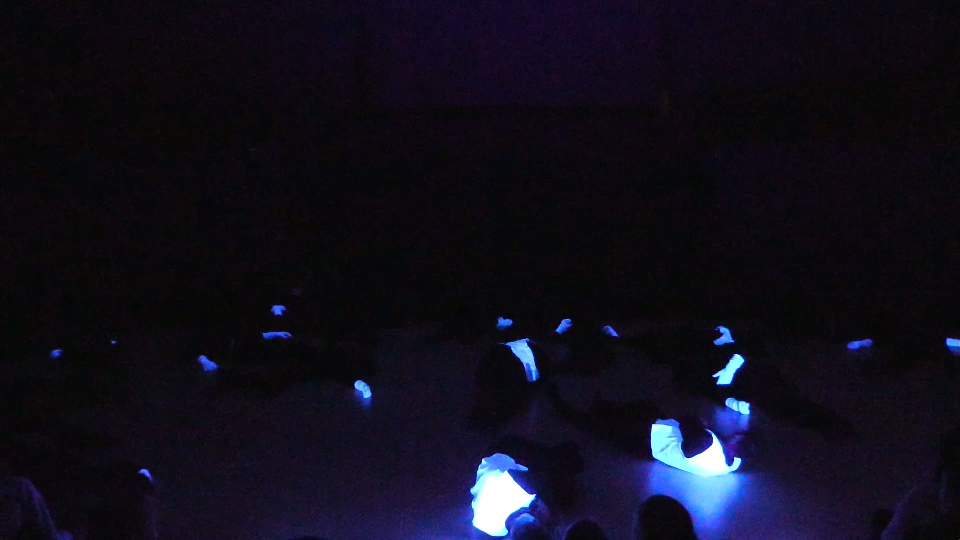 und erreichten einen hohen atmosphärischen Effekt durch die Kombination unseres aufgesplitteten Spiels mit Schwarzlicht-Szenerien, weshalb die Kostüme und alle Ausstattungsgegenstände in Schwarz und reflektierendem Weiß gewählt und hergestellt wurden.